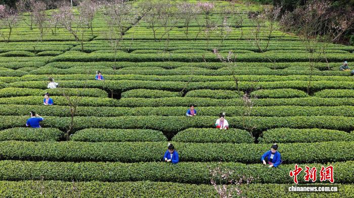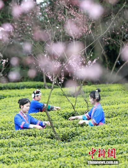 广西三江:桃花映茶园 春日采茶忙